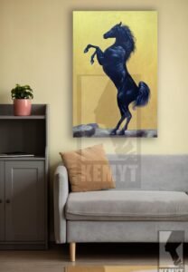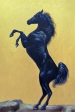 Majestic Power captures the raw strength and elegance of a black stallion rearing proudly against a radiant golden backdrop. The horse’s glossy coat shimmers with deep blues and purples, highlighting its muscular form and spirited motion. The bold contrast between the dark figure and the luminous background symbolizes freedom, dominance, and untamed energy—making this artwork a striking tribute to the noble spirit of the horse.