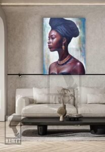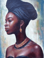 This striking portrait captures the quiet strength and timeless elegance of a woman draped in regal simplicity. Her rich skin tones are rendered with warmth and depth, while the dramatic headwrap and intricate jewelry add a sense of cultural pride and majesty. The background, softly textured with light and color, allows the viewer’s focus to rest entirely on her poised expression and graceful form. With every detail—her calm gaze, the curve of her neck, the subtle sheen on her skin—this painting speaks volumes about beauty, identity, and dignity in silence.