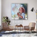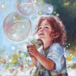 This delightful painting captures the pure joy of childhood. A young child with curly brown hair and a look of wonderment gazes upwards at a cluster of large, iridescent soap bubbles floating in the air. The artist has used soft, dreamy colors and gentle brushstrokes to create a lighthearted and whimsical atmosphere.