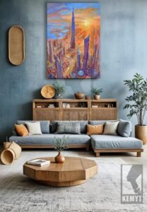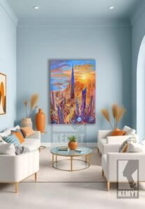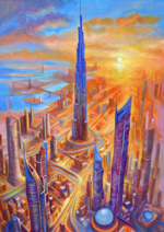 This dynamic painting captures the heart of Dubai in a blaze of color, energy, and movement. At the center stands the iconic Burj Khalifa, rising defiantly into a radiant sky painted with fiery oranges and soft blues, evoking both sunrise and the boundless ambition of the city. The surrounding skyscrapers twist and shimmer with stylized brushwork, while winding roads and futuristic structures pulse with rhythm and life. The blend of cool and warm tones brings a dreamlike atmosphere, portraying Dubai not just as a place, but as a vision—alive, glowing, and always reaching higher. It’s a celebration of innovation, architectural marvels, and the unstoppable spirit of progress.