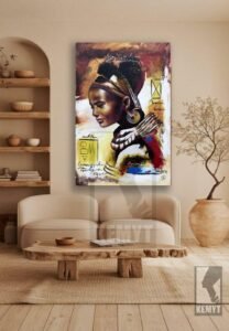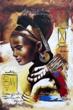 This powerful and expressive portrait honors African heritage through bold brushwork, rich textures, and symbolic elements. The woman, adorned with traditional jewelry, elongated earrings, and stacked neck rings, exudes grace and pride. Her head is crowned with cultural motifs and abstract symbols, hinting at ancestral stories and wisdom. Warm earthy tones, mixed with strokes of white, blue, and red, blend the past and present into one dynamic composition. Handwritten scripts and glyph-like markings add a mysterious, almost spiritual layer to the artwork, making it not just a portrait—but a narrative of identity and strength.