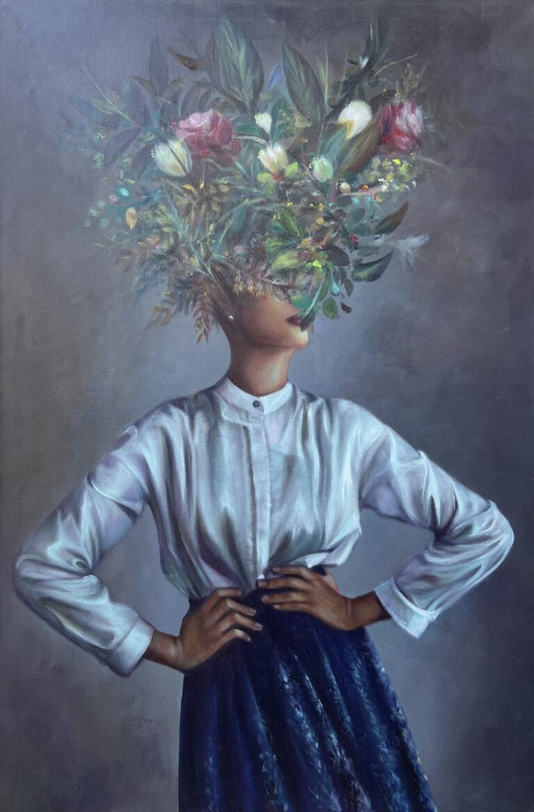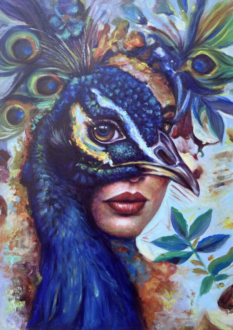 2This thought-provoking painting blends portraiture with surrealism, depicting a woman floating between two realms. Her face merges with the horizon, where the sun and water meet, evoking themes of transformation, surrender, and serenity. The warm, rich hues create an atmosphere of quiet intensity, inviting viewers to explore the balance between self and nature.