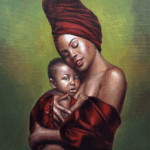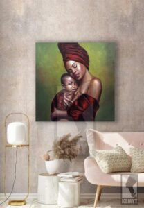 Embrace of Grace is a moving portrayal of maternal love and the sacred bond between mother and child. Bathed in warm, earthy tones, the composition radiates tenderness and security. The mother, adorned in a deep red headwrap and robe, cradles her child with serene strength, her eyes closed in peaceful connection. The child gazes outward, nestled in the safety of her arms, capturing a moment that is both intimate and universal. This piece celebrates motherhood, resilience, and the beauty of unconditional love.