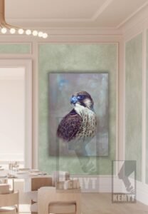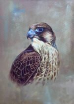 This painting offers a detailed close-up of a falcon’s head and upper body. The bird of prey is depicted with striking clarity, showcasing its sharp, intelligent blue eyes and powerful, hooked beak. The artist has meticulously rendered the intricate patterns and textures of its feathers, which range in color from rich browns and creams to darker, almost black markings. The falcon’s gaze is direct and piercing, conveying a sense of alertness and keen vision. The background is kept soft and muted, allowing the viewer to focus entirely on the majestic bird and its intense expression.