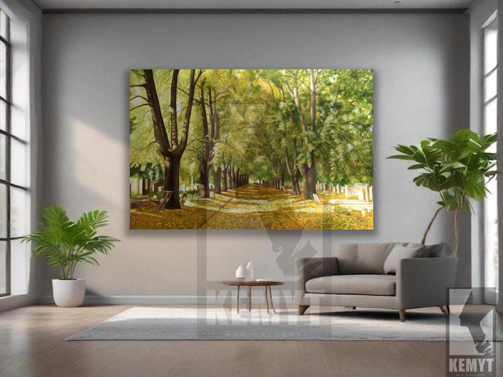 This breathtaking painting captures the serenity of a sunlit pathway lined with towering trees, their lush green and golden foliage filtering soft light onto the ground. The warm hues of autumn leaves contrast beautifully with the deep greens, creating a peaceful and inviting atmosphere. The perspective draws the viewer into the depth of the scene, evoking a sense of tranquility and reflection. A perfect piece for nature lovers and those who appreciate the quiet beauty of changing seasons.