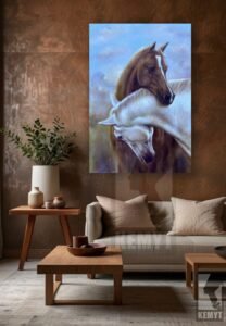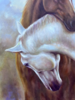 Kindred Spirits captures a tender moment between two horses, their heads gently resting on each other in a silent expression of trust and connection. The warm chestnut and soft white hues of the horses are painted with graceful realism, set against a dreamy sky of pastel blues and purples. This artwork speaks to the quiet strength of companionship and the unspoken bond that exists between kindred souls.