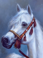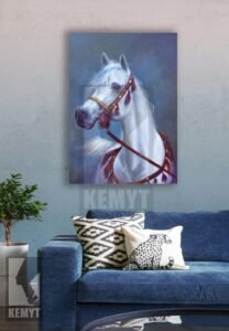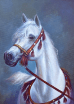 This elegant painting captures the timeless beauty and strength of an Arabian horse. With its flowing white mane, soulful dark eyes, and proud posture, the horse stands adorned in a traditional red bridle decorated with stars, tassels, and intricate golden details. The soft, dreamy background of muted blues and purples enhances the noble character of the animal, making it feel almost ethereal. This artwork celebrates the spirit, grace, and pride of one of the world’s most cherished horse breeds, symbolizing freedom, nobility, and enduring beauty.