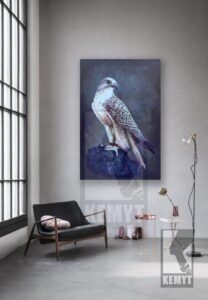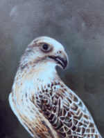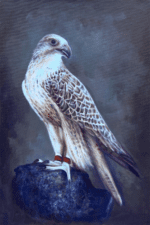This striking painting captures the regal presence of a falcon perched atop a dark, textured stone. The bird, rendered in exquisite detail, is predominantly white with intricate patterns of brown and gray markings across its wings and back. Its sharp, focused gaze is directed slightly to the left, conveying a sense of keen awareness and predatory intelligence.