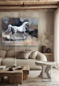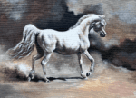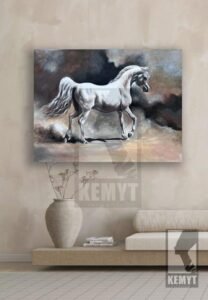 This painting presents a striking image of a white Arabian horse, captured in motion across a sandy landscape. The horse, with its flowing mane and tail, is depicted with elegant lines and a sense of powerful grace. The artist has used a palette of soft browns, creams, and whites to convey the horse’s pristine coat and the surrounding desert environment.