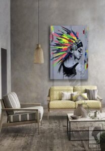 The grayscale rendering of the woman’s face and form evokes calm strength and introspection, while the surrounding colors add an energy that seems to radiate from within. The drips and abstract marks around her lend the piece a raw, contemporary edge, blending street art energy with classic portraiture.