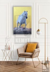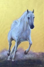 Spirit in Motion captures the grace and vitality of a white horse galloping freely across an abstract landscape. Set against a glowing golden backdrop, the horse’s flowing mane and powerful stride evoke energy, freedom, and an untamed spirit. Hints of purple and blue in the shadows lend a dreamlike aura to the piece, making it a stunning representation of beauty in movement and strength in serenity.