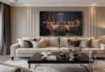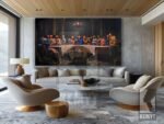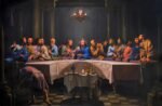 This painting depicts a scene reminiscent of “The Last Supper” by Leonardo da Vinci. It shows a group of figures gathered around a long table, set within a grand, dimly lit hall. The central figure, likely representing Jesus, is dressed in blue and appears to be in conversation with those around him. The other figures, presumably his disciples, are engaged in various gestures and expressions, conveying a range of emotions.