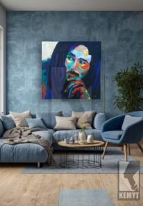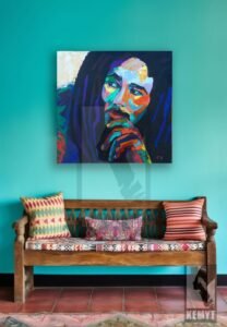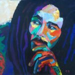 This striking portrait is a vibrant tribute to the legendary Bob Marley, capturing his essence through an explosion of bold colors and dynamic brushstrokes. The expressive use of blues, greens, and fiery oranges reflects the passion, depth, and spirituality that defined both his music and persona. With a contemplative gaze and hand resting thoughtfully, this piece embodies the reggae icon’s introspective nature and enduring influence on generations worldwide. A celebration of music, freedom, and artistic expression, this painting resonates with the powerful legacy Marley left behind.