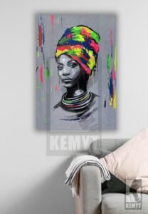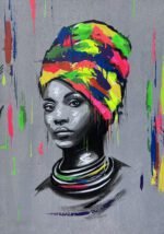 The interplay between the monochrome realism of the face and the abstract chaos of colors symbolizes the coexistence of inner strength and outer vibrancy — calm dignity beneath expressive identity. Each brushstroke tells a story of culture, pride, and transformation.