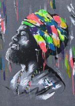 This striking painting captures a powerful portrait of a bearded man in profile, rendered in grayscale with exquisite detail and emotion. His expression is one of serene contemplation, gazing upward as though lost in thought or prayer. The black-and-white base is brilliantly contrasted with a vivid explosion of neon colors across his turban and surroundings — electric pinks, luminous greens, yellows, and blues — applied in bold, expressive strokes and drips that energize the composition.