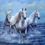 This breathtaking painting captures three magnificent white horses charging through the ocean waves, exuding power, grace, and untamed spirit. The artist masterfully blends soft blues and whites to create a sense of movement and energy, while the horses’ flowing manes and intense gazes evoke a feeling of freedom and determination.