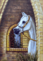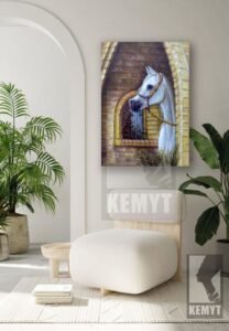 This painting beautifully captures the serene profile of a white Arabian horse, framed by the warm tones of a stone archway. The horse’s elegant neck is adorned with a decorative bridle, hinting at its noble heritage. The artist has skillfully rendered the texture of the stone and the soft light that illuminates the scene, creating a sense of peace and tranquility. A glimpse of greenery through a window adds a touch of life and color to the composition. The overall effect is one of quiet beauty and gentle grace.